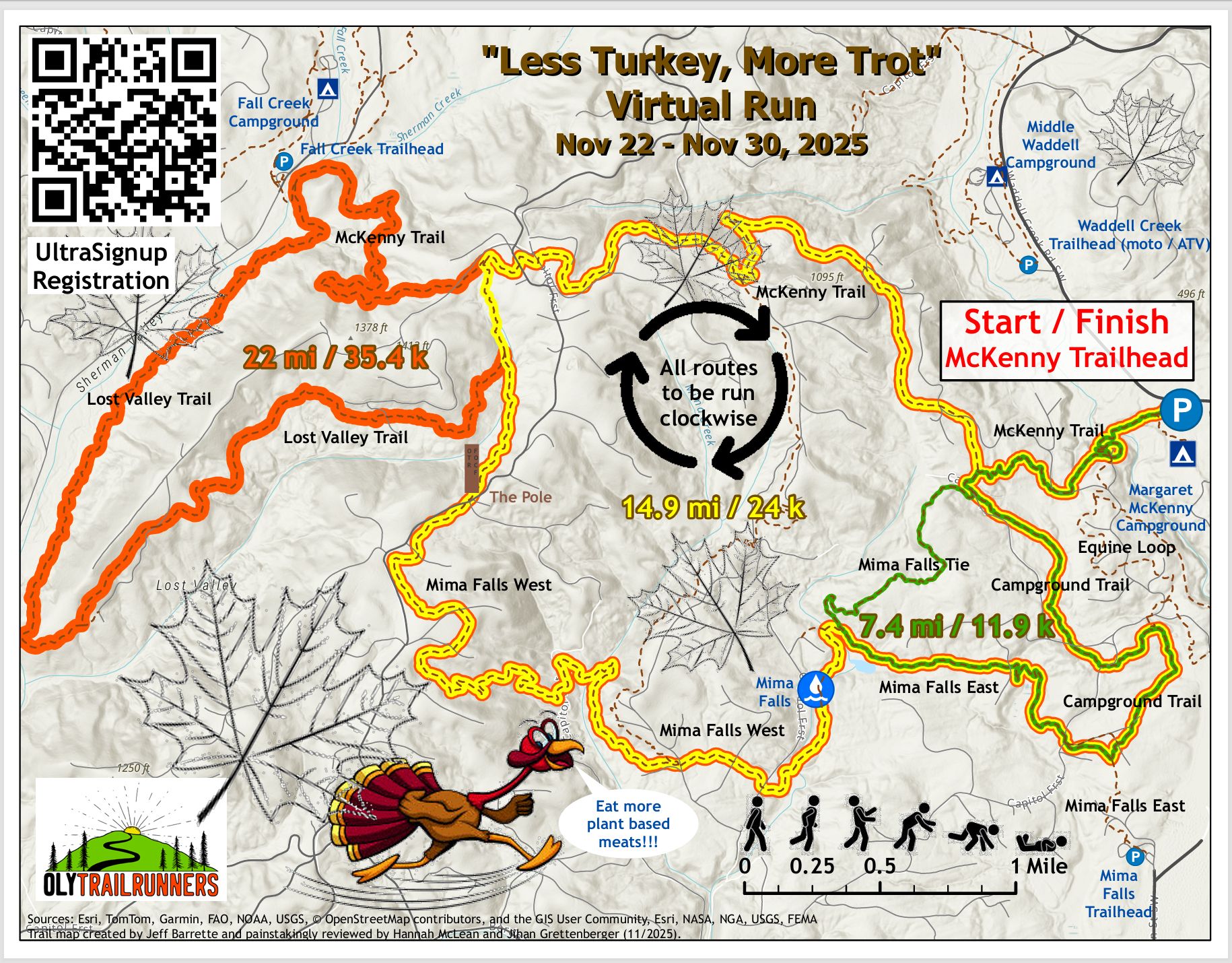 There are three distances: 7.4 miles (12 km), 14.9 miles (24 km), 22 miles (33.4 km) and all start from the McKenny Trailhead in Capitol Forest. ** The course will be marked but if you are unfamiliar with the area, be sure to take the map with you. **